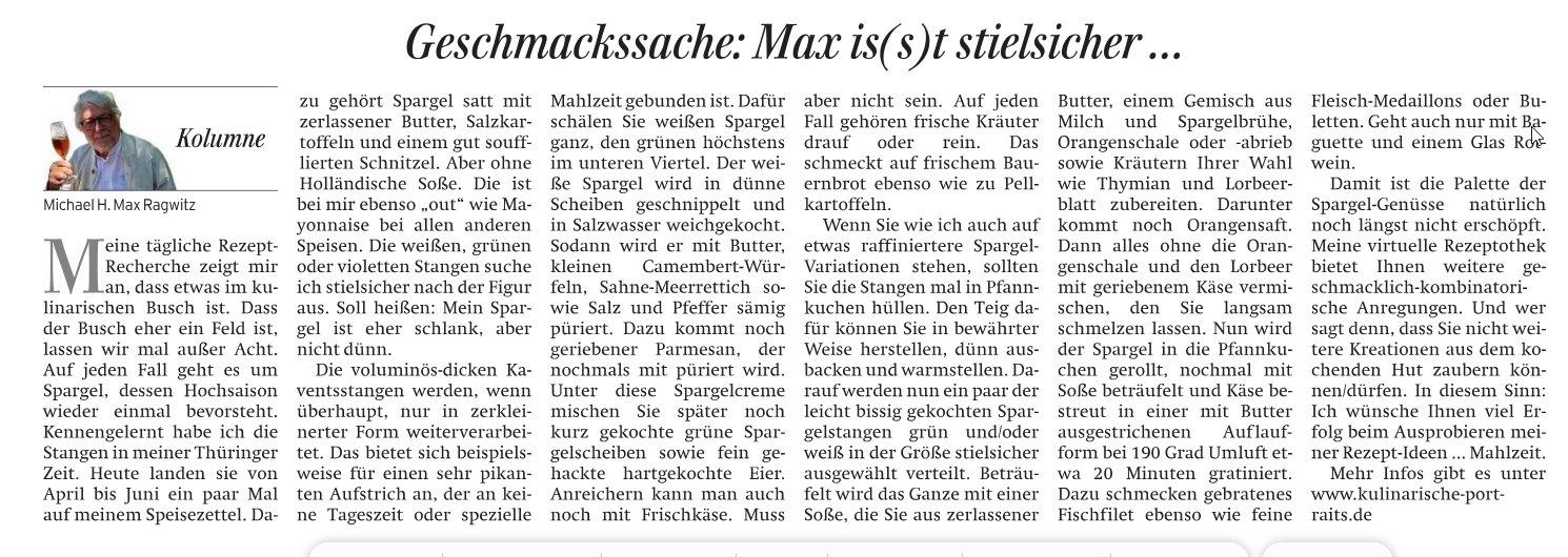 Meine tägliche Rezept-Recherche zeigt mir an, dass etwas im kulinarischen Busch ist. Dass der Busch eher ein Feld ist, lassen wir mal außer Acht. Auf jeden Fall geht es um Spargel, dessen Hohe Zeit wieder einmal bevorsteht. Kennengelernt habe ich die Stangen in meiner Thüringer Zeit. Heute landen sie von April bis Juni ein paar Mal auf meinem Speisezettel. Dazu gehört Spargel satt mit zerlassener Butter, Salzkartoffeln und einem gut soufflierten Schnitzel. Aber ohne Holländische Soße. Die ist bei mir ebenso „out“ wie Mayonnaise bei allen anderen Speisen. Die weißen, grünen oder violetten Stangen suche ich stielsicher nach der Figur aus. Soll heißen: Mein Spargel ist eher schlank, aber nicht dünn. Die voluminös-dicken Kaventsstangen werden, wenn überhaupt, nur in zerkleinerter Form weiterverarbeitet.